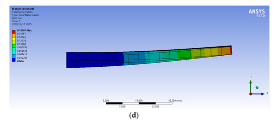 In order to verify that the deformation of the part can be effectively controlled using this machining method, the finite element simulation method was used for preliminary verification. We extended the workpiece blade along the edge of the spiral, which was approximately equivalent to a thin plate with a variable cross-section. This model was imported into ANSYS software. The material characteristics were set according to the parameters in Table 1 and Table 2 in ANSYS software, the cutting force was loaded in the middle of the workpiece along the direction of the cutting edge of the cutting tool, and a positioning constraint was set at the bottom of the workpiece to ensure that the workpiece did not move during the simulation. Deformation during machining was then simulated, as shown in Figure 5.