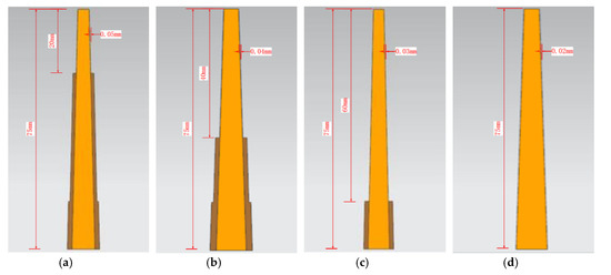 Semi-finishing and finishing were performed in four steps. The cutting parameters were: (a) vc = 75 m/min, fz = 0.0375 mm/z, ap = 20 mm, ae = 0.01 mm; (b) vc = 75 m/min, fz = 0.0375 mm/z, ap = 40 mm, ae = 0.01 mm; (c) vc = 75 m/min, fz = 0.0375 mm/z, ap = 60 mm, ae = 0.01 mm; (d) vc = 75 m/min, fz = 0.0375 mm/z, ap = 75 mm, ae = 0.01 mm. The cutting depths (20, 40, 60, and 75 mm) and workpiece allowances (0.05 mm, 0.04 mm, 0.03 mm, and 0.02 mm) after each step are shown in Figure 7. Different processing parameters and machining allowances were selected during the process to ensure that the material had good rigidity and processing accuracy.