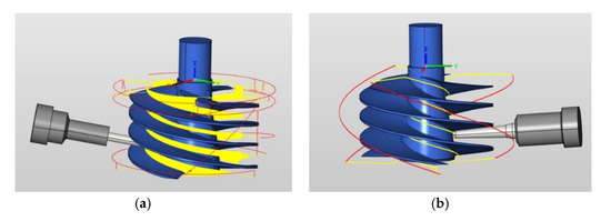 Emulsion cooling was used during processing and a milling method was adopted. A cycloidal milling method was used during the rough machining process and cycloid machining path was generated using HyperMILL software. The cutting parameters were: vc = 75 m/min; fz = 0.1 mm/z; ap = 15 mm; ae = 0.6 mm. A five-axis numerically controlled (NC) milling method without auxiliary support was used during semi-finishing and finishing. Cutting parameters were as described in the previous section. The processing path is shown in Figure 8.