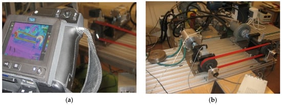 Thermovision set-up for testing heat concentration (a) and an experimental test stand (b) for the thermal condition of a belt transmission with a heat-welded V-belt.