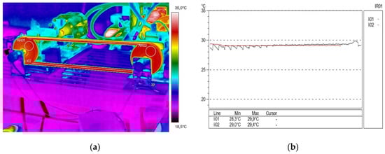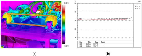 Then, approximately 30 min after re-unloading the transmission and turning on the blowers, another thermogram was recorded (Figure 8a) at a rotational speed of the driving pulley of 1500 rpm and a transmission breaking torque load of 2.15 N∙m. At that time, the difference between the temperature in active (30.4 °C) and passive (31.0 °C) connectors was small (approximately 0.6 °C). In the profilograms (Figure 8b), the stabilization of the V-belt temperature distribution is visible.