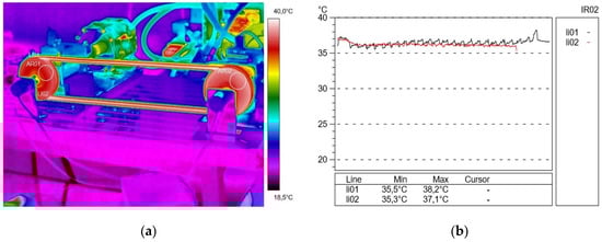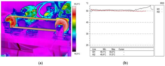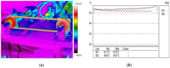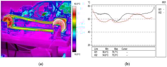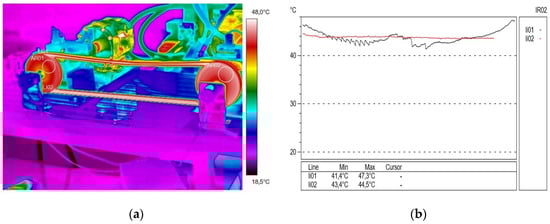 Thermogram (a) and profilograms (b): temperature distribution on the V-belt recorded at a rotational speed of 1000 rpm and a braking torque load of 12.75 N∙m, red color—active connector and black color—passive connector.