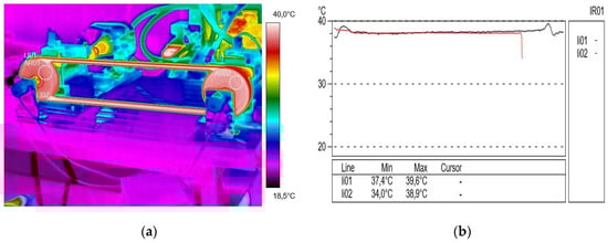 Thermogram (a) and profilogram (b): temperature distribution on the V-belt recorded at a rotational speed of 500 rpm and a braking torque load of 13 N∙m (only transmission resistance), red color—active connector and black color—passive connector.