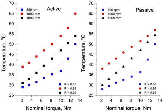 Figure 10 shows that for a rotational speed of 500 rpm, the temperature difference between the connectors was 0.5 °C over the entire tested range; however, from a load value of 2.15 Nm to 9 Nm, the temperature change had a linear behavior, and above this value, it quickly increased to a value of approximately 51 °C. For the higher rotational speed of 1000 rpm, a temperature difference of 2 °C was recorded for a torque load of 10 N m. The results indicate that an increasing of the load caused an increase in the temperature difference to approximately 8 °C for a braking torque load of 13 Nm. For a rotational speed of 1500 rpm, both the value and the temperature difference were the smallest and assumed a stabilized value throughout the entire test ranging from 2.15–8.75 Nm. It is significant that there is a change in active and passive connector temperatures slightly above 4 Nm and from that moment, the passive connector has a slightly higher temperature than the active one. The difference is relatively small and for a load of 8.4 Nm, it is 1.4 °C. The reason for the differences is the introduction of the passive connector into the vibrations.