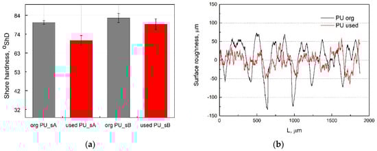 Shore hardness (a) and surface roughness profiles (R profiles) (b) of the polyurethane belt: original PU belt and used PU belt.