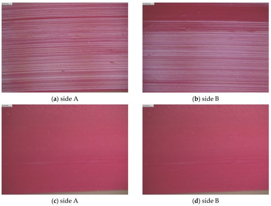 Microscopic images of a new belt surface (a,b) and a used PU belt (c,d), designated as sides A and B (×10 magnification).