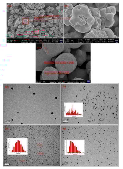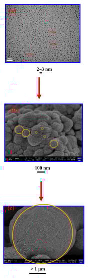 The morphologies of the Cu-NPs obtained from MW irradiation can be observed from the SEM micrographs demonstrated in Figure 1. A lot of copper microparticles (Cu-MPs) with diameters around 5–10 μm are seen in Figure 1a. Surprisingly, some of the particle surfaces became blurred (melted) during SEM scanning. Similar melting phenomenon and mechanism were also found for various metal particles [36,37,38,39,40,41,42]. After magnifying the blurred area to 10 times (Figure 1b), the surface melting phenomenon was clearly observed. SEM scanning is performed by projecting an e-beam on the samples, which can also generate heat on the sample during image construction. However, the generated thermal energies cannot be over 1000 °C to induce the melting of Cu crystals (Tm ≈ 1085 °C). The only reasonable explanation for such low temperature melting, is that the surfaces of the obtained Cu-MPs are actually composed of lots of small sized Cu-NPs whose loose structures allow them to melt at temperatures well below the normal melting point. In fact, what we obtained after swift MW irradiation in the presence of TETA is Cu-NPs with size below 10 nm and are likely to melt from the heat generated during image construction. To confirm the presence of small sized Cu-NPs, the image of the non-melting area in Figure 1a was magnified 100 times and illustrated in Figure 1c. The surfaces of the particles found in Figure 1a are actually made of the aggregated Cu-NPs with sizes below 10 nm, which can melt upon the irradiation of the e-beam.