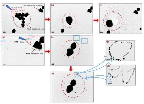 The heavily irradiated area by longer e-beam exposure is marked with dashed red circles in Figure 3. Melting occurred only within heavily exposed areas (similar to focused area in optical microscopy), as observed from Figure 3b,c. The particles in the less irradiated area (outside the focused area) remain intact, without significant melting or fusion. During the initial stage of TEM scanning, neither melting nor tiny dots can be perceived in Figure 3a. However, several aggregated particles within the highly irradiated area started to melt and impinge (agglomerate) into one big particle with smooth surface in a very short time, as demonstrated in Figure 3b.