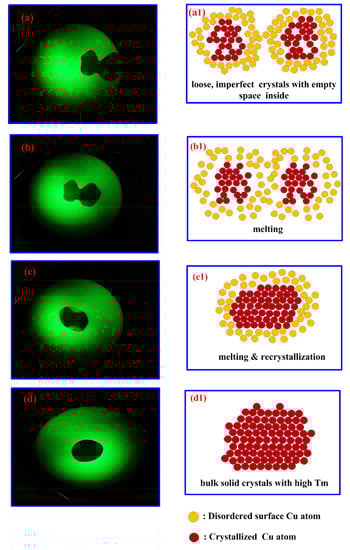 Schematic diagrams that depict the e-beam induced melting/recrystallization of Cu-NPs or Cu-MPs were drawn and put side by side with the pictures taken directly from the TEM monitor screen, as illustrated in Figure 4. Figure 4a reveals two impinging Cu particles carrying out fusion upon e-beam irradiation during image construction, as depicted in Figure 4a1. These two particles with micro-sizes are actually made of imperfect crystals with disordered Cu atoms on the surface (more) and inside (less). When the exposure time is increased (Figure 4b,b1), the particles impinge further and the centers of these two particles come closer. The impingement and following fusion was enhanced when exposure was further increased (Figure 4c). Significant bulk (inside) atom rearrangements (recrystallization) were believed to appear like in Figure 4c1, which demonstrates compact and perfect crystallinity, gradually created by consuming bulk disordered atoms. Eventually, after longer exposure, the surface atoms join the bulk crystallization and only one single particle is observed on the screen (Figure 4d). A robust solid-state crystal, described in Figure 4d1, is formed and no further melting can be observed, since its melting point is returned to normal at around 1085 °C after recrystallization.