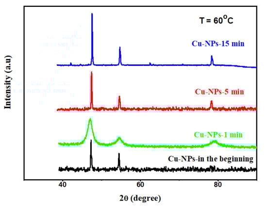 The neat small sized Cu-NPs prepared from the MW irradiation are structurally instable and can easily melt and recrystallize into compact crystals by slight thermal perturbation during the image construction of SEM and TEM. The X-ray diffraction (XRD) patterns of the small sized Cu-NPs, which stay for different times at 60 °C, can tell how long the Cu-NPs will go on structural reorganization and reordering. Fresh samples demonstrated the same pattern as common Cu crystals, with significant peaks of 100, 200, and 220, according to Figure 5. Surprisingly, the sample started to melt (coagulate) in less than 1 min at 60 °C, and a loose crystalline pattern was observed in Figure 5. However, the loose crystalline structure, which was created by staying for 1 min at 60 °C, could originate from either melting or recrystallizing Cu-NPs. When the staying time was over 5 min at 60 °C, perfect X-ray diffraction patterns, like the common Cu crystalline structure, were observed. The perfect X-ray diffraction patterns were contributed by the agglomerated particles or the regenerated tiny crystallites found around the exposed big particles, under the irradiation of the e-beams of electron microscopies. The recrystallized Cu crystals have perfect crystalline structure with Tm equal to 1085 °C, and no further melting phenomena (broadened peaks) was found after a longer time at 60 °C.
