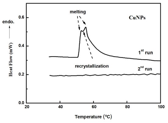Peaks disappeared in the second heating run, indicating that all the Cu-NPs have melted and have recrystallized into larger solid-state particles before 60 °C, before the second run. Since the Tm of the small sized Cu-NP is very close to 60 °C, it explains why the Cu-NPs can melt and agglomerate together into perfect crystals when exposed to e-beam during image construction (SEM and TEM).
