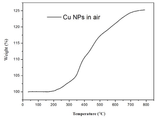 No significant weight change was found until 180 °C in the air for TGA thermogram demonstrated in Figure 7. It indicates that most of the residual TETAs were removed by washing with water and ethanol alternatively. The Cu-NPs illustrated significant oxidation and became Cu2O or CuO only after 200 °C. It confirmed that the prepared Cu-NPs good thermal stability in the air.