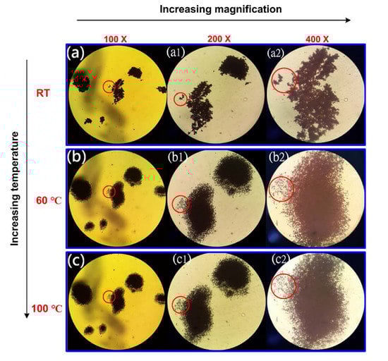 Optical microscopic pictures of Cu-NPs taken at (a) RT, (b) 60 °C, and (c) 100 °C, with 100×, 200×, and 400× magnifications, respectively.