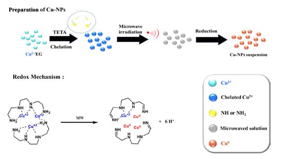 - Tseng, P.H.; Wang, Y.Z.; Hsieh, T.H.; Ho, K.S.; Tsai, C.H.; Chen, K.T. Preparation of low size copper nanoparticles by microwave irradiation in the presence of triethylene tetramine. Nanotechnology 2018, 29, 085603. [Google Scholar] [CrossRef]