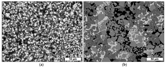 The analysis of the sample microstructure was performed by scanning electron microscopy with an acceleration voltage of 25 kV (SEM, Quanta 2000, FEI, Hillsboro, OR, USA) after grinding the specimen surface with 180-, 600-, 2000-grit SiC paper and polishing with a 3-µm diamond dispersion. The quantitative phase composition in the composite materials was analyzed by powder X-ray diffraction, XRD (D500 diffractometer, Siemens AG, Karlsruhe, Germany) using copper Kα1/α2 radiation after ball-milling the respective sample for 5 min at 300 rpm. The grinded powder was filled into a backloading sample holder and measured in a θ/θ reflection geometry with a 2θ range from 5° to 70°. The obtained diffraction patterns were analyzed by the Rietveld technique using the Topas Academic 5 package (Coelho Software, Brisbane, Australia).