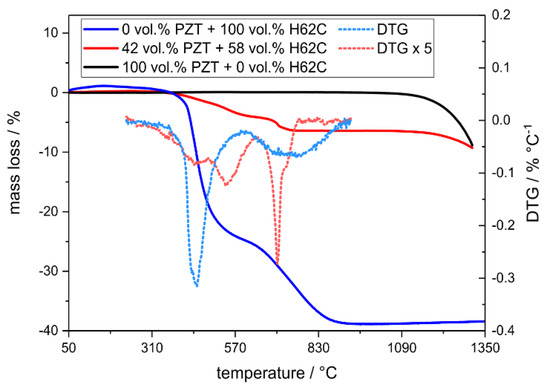 The pure PZT filler is stable up to approximately 1000 °C with respect to the TG data; no significant weight change is observed. However, in the temperature regime between 1000 and 1300 °C, a weight loss of 9 wt.% is observed as a consequence of the decomposition of the PZT powder due to the evaporative loss of PbO [18].