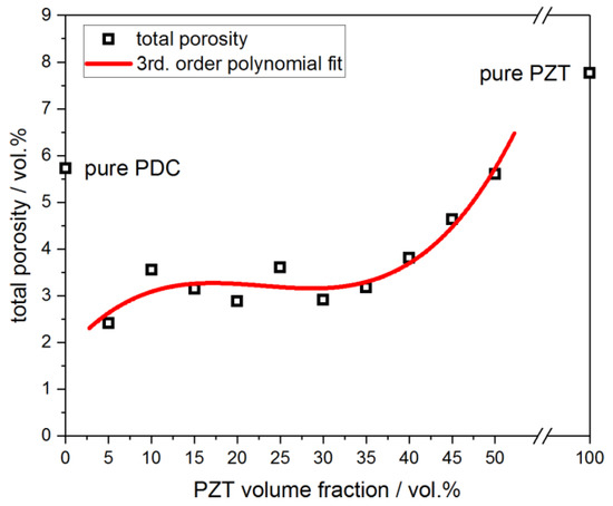 Porosity of the PZT-polymer composites crosslinked at 200 °C as a function of the PZT filler volume fraction.