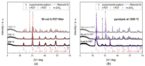 Powder XRD patterns for PZT-polymer and PZT-PDC composites together with the corresponding Rietveld fits. (a) The variation in the heat treatment temperature at a constant PZT load of 50 vol.%; (b) the variation in the PZT volume fraction for a pyrolysis temperature of 1250 °C.