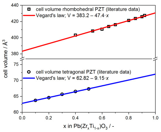 Literature data of the unit cell volume as a function of the Zr content x in rhombohedral (□) and tetragonal Pb(ZrxTi1−x)O3 (○). The data were fitted by Vegard’s law, which was subsequently applied in determining the Zr content x in the PZT filler from its unit cell volume.