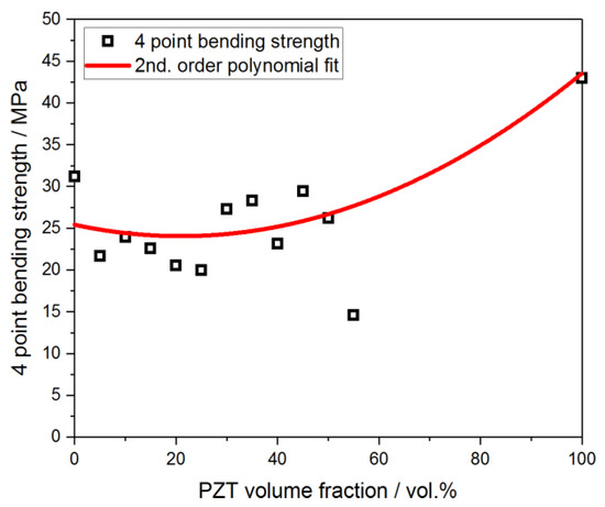Four-point bending strength of PZT-polymer composites cured at 200 °C as a function of the filler content.