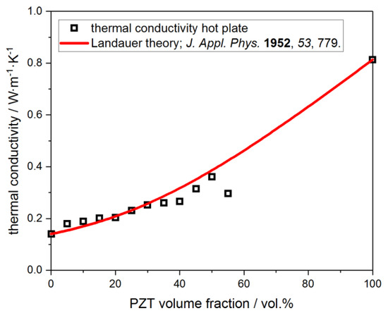 Experimental thermal conductivity (hot plate technique) of PZT-polymer composites cured at 200 °C as a function of the filler content. The observed data (□) fits well to the values extrapolated by the Landauer theory (red line).