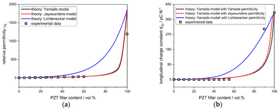 Experimental results for the relative permittivity (a) and the piezoelectric charge constant d33 (b) of PZT-polymer composites, the pure polymer matrix, and the pure PZT filler. The experimental data could be modelled sufficiently using the models of Yamada and Jayasundere for the extrapolation of the permittivity and d33 data.