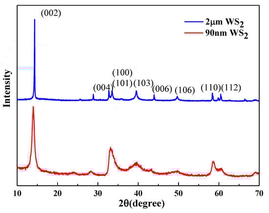 It has been found that the size and crystal structure of WS2 particles in the medium have different effects on anti-wear and anti-friction performance [17,18,19,20,21,22,23]. When 90 nm of WS2 was added to the lubricating oil at a mass fraction of 0.01%, it showed excellent anti-wear and anti-friction performance, and the tribological performance of layered nanometer tungsten disulfide was better than that of lamellar tungsten disulfide [24].