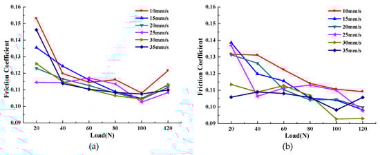 It can be seen from Figure 4 that the COF curve changes in the same trend with the load at each sliding velocity. The average COF of sample oil #1 decreased first and then increased as the load increased. The minimum COF was concentrated at about 100 N, and by calculation, the COF was reduced by a maximum of 29.35%. The average COF of sample oil #2 decreased gradually with the increase of load. In the range of the experimental load, the minimum coefficient was concentrated at 120 N, and by calculation, the COF was reduced by a maximum of 30.24%.