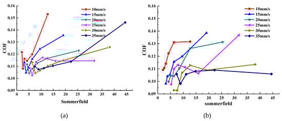 Comparison of Stribeck curves of sample oil at different sliding speeds: (a) sample oil #1; (b) sample oil #2.
