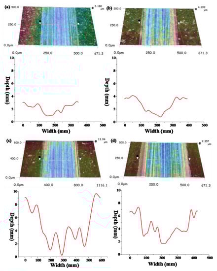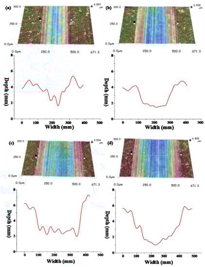 Three-dimensional morphologies and wear tracks of the wear scars corresponding to sample oil #1 under four different loads at the same sliding velocity: (a) 20; (b) 60; (c) 100; (d) 120 N.