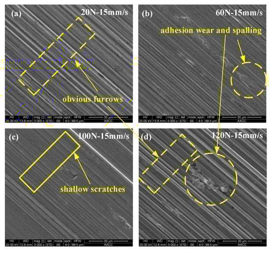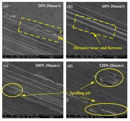 SEM of wear scars of sample oil #2 under different loads at the same sliding speed. (a) 20 N-20 mm/s; (b) 60 N-20 mm/s; (c) 100 N-20 mm/s; (d) 120 N-20 mm/s.