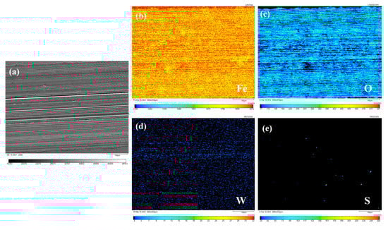 It can be found from the distribution diagram of each element in Figure 11 that elements Fe and O are very densely distributed, the element W is evenly distributed, and the element S is the least distributed. According to literature [31,32,33,34,35], it was found that oxidation products were formed on the friction surface through the X-ray photoelectron spectroscopy (XPS) analysis of the friction surface after the test. After further study on the products formed, it was found that the Fe 2p peak corresponds to Fe2O3 or FeO, and the worn surface appeared on FeO and Fe2O3 film. The XPS data indicate that a frictional chemical reaction occurs on the surface of the wear steel during the friction process, thus forming the boundary lubrication film composed of WO3, Fe2O3, and FeO. Therefore, it can be speculated that the friction surface is most likely to form a dense chemical reaction film containing Fe2O3 and FeO through chemical reactions [31,32,33,34,35]. In addition, the element W is evenly distributed on the friction surface, while the element S is scarce on the friction surface, indicating that W is most likely to form tungsten oxide on the surface. The presence of trace element S indicates that there is still trace lamellar WS2 on the friction surface.