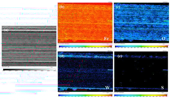 The composition and distribution of elements on the surface of wear marks were analyzed using EPMA to grasp the chemical changes on the worn surface. A wear scar of sample oil #1 with a 100 N load and 15 mm/s sliding speed, and a wear scar of sample oil #2 with a 120 N load and 20 mm/s sliding speed were used as examples. The results of their characterization are shown in Figure 11 and Figure 12. (a)–(e) correspond to the SEM diagram of the wear scar (a) and the distribution diagram of Fe (b), O (c), W (d), and S (e), respectively.