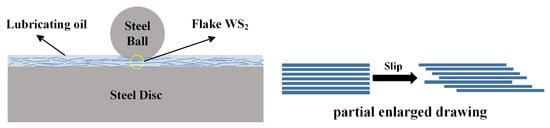 The lubrication mechanism of lamellar WS2 as an additive is shown in Figure 13. The lamellar WS2 dispersed in the lubricating oil is partially deposited on the surface of the friction pair to form a physical deposition film under the action of frictional shear and normal load. Due to the crystal structure of lamellar WS2, the layer to layer is connected by weak van der Waals force, and the surface is easy to slip, which leads to the reduction of COF. Moreover, the deposition film prevents the direct contact of the friction surface; therefore, the wear is reduced, and the anti-wear performance of the lubricating oil is improved.