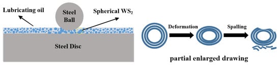 For spherical WS2 particles, the lubricating mechanism is roughly shown in Figure 14 when it is used as a lubricant additive. Nanoparticles have excellent adsorption and dispersal: therefore, the spherical nano-WS2 dispersed in the lubricating oil will slowly be deposited on the surface of the friction pair to form a certain thickness of physical deposited film during the process of friction, preventing direct contact of the friction pair surface. The spherical structure of WS2 can be regarded as a ‘small ball’, which can play a similar role as a ‘micro-bearing’ on the friction surface, changing the sliding friction between the surfaces into rolling friction, thereby reducing the COF. With the action of frictional shear force and normal load, the spherical WS2 will be deformed by squeezing and even peeling off. The exfoliated WS2 molecular layer will remain on the pits and peak tips of the friction surface, covering the contact point, thereby reducing the direct contact of friction pair, and then reducing friction and wear. In addition, the peaks of some micro-convex bodies on the surface of the friction pair will penetrate the lubricating oil film and directly contact, collide, and break, accompanied by abrasive particles and new wear scars. With the generation of new wear scars, spherical WS2 with small sizes will fill in the scratches generated by grinding, playing a role in repairing the friction surface and making the surface smooth: thus, reducing the COF and reducing wear.
