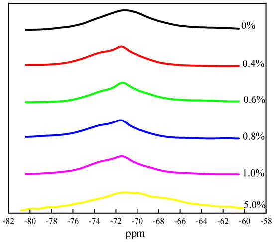 The solid nuclear magnetic resonance technology is useful for obtaining information about the structure of the material by analyzing the NMR spectra. Information regarding the number, position, width, and area of spectral lines can be inferred from the signal obtained by the NMR spectrum diagram. The number and position of spectral lines are reflected by the chemical shift; the changes in chemical shift indicate the changes in the chemical environment in which the nucleus is located, namely, the molecular structure of the material [19,20]. In the 29Si MAS NMR study, the chemical environment of 29Si is represented by Qn, where n (0–4) is the number of oxygen atoms shared by each silicon–oxygen tetrahedron and the adjacent silicon–oxygen tetrahedral. While Q0 represents an island-shaped [SiO4] tetrahedron with a chemical shift in the range of −68 to −79 ppm, Q1 represents the silicon–oxygen tetrahedron connected with one silicon–oxygen tetrahedron, that is, the silicon–oxygen tetrahedron is at the end of the straight chain in the dimer or hypermer, and the chemical shift is in the range of −76~−82 ppm. Further, Q2 represents the silicon–oxygen tetrahedron connected with two silicon–oxygen tetrahedrons, that is, the silicon–oxygen tetrahedron is in the middle of the straight chain or in the ring structure, and the chemical shift is in the range of −82~−88 ppm. Similarly, Q3 indicates the silicon–oxygen tetrahedron connected with three silicon–oxygen tetrahedrons, which has the branch of chain, double-chain polymerization structure, or layered structure with a chemical shift in the range of −88~−98 ppm. Finally, Q4 depicts four silicon–oxygen tetrahedrons forming a three-dimensional network structure with a chemical shift in the range of −98~−129 ppm [19,20,21,22].