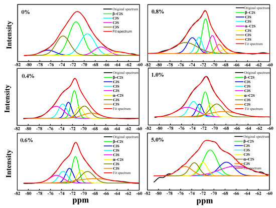In this 29Si MAS NMR analysis, the NMR spectrum peaks can be fitted. Different chemical shifts represent different structures in the sample. Deconvolution integration is performed to calculate the integrated area, and then the relative content of different structures can be estimated [23]. C2S has four crystal forms, namely, α-C2S, α’L-C2S, β-C2S, and γ-C2S. The chemical shifts corresponding to each crystal form are −70.7, −70.8, −71.4, and −73.5 ppm. C3S has 9 Si sites, the chemical shifts of which correspond to 7 positions of −69.2, −71.9, −72.9, −73.6, −73.8, −74.0, and −74.7 ppm, respectively [24]. Figure 2 depicts the peak fitting of the original spectrum using PeakFit software. This helped to determine the mineral phase composition represented by each peak position, and the area integral formula was used to calculate the relative content of each mineral phase. The relative percentages of C3S, β-C2S, a-C2S, and C2S, and the ratio of C2S to C3S were obtained, as shown in Table 3. With an increase in Cr content, the relative content of C3S gradually decreases, while that of C2S and β-C2S gradually increases. Further, the ratio of C2S to C3S shows an upward trend. The relative content of α-C2S reaches a maximum of 13.46% when the Cr content is 1.0%, and then decreases. When the Cr content is 5.0%, the relative content of C3S in the clinker reaches 32.56%, while that of C2S and β-C2S is 27.44% and 37.44%, respectively. The ratio of C2S to C3S is 0.6, probably due to the introduction of heavy metal Cr. Studies have shown that some heavy metal elements (Cr, Pb, Cd, Zn, etc.) act as stabilizers in the clinker calcination. They reduce the decomposition temperature of CaCO3 and the formation temperature of C2S, thus stabilizing β-C2S, and then consequently C2S, leading to an increase in C2S content [25]. In this study, since the addition of Cr has a positive effect on the cell size and the stability of the crystal form of β-C2S, the C2S content was seen to increase accordingly. The greater the amount of Cr, the more obvious was the effect on C2S.