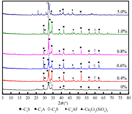 XRD analysis of Cr-doped cement clinker was performed. Figure 3 shows that the main mineral phases in the Cr-doped clinker are C3S, C2S, C3A, and C4AF. Compared with the blank sample, the C2S and C3S diffraction peaks for the five kinds of Cr-doped clinker are obvious. As the Cr amount increases, the C2S peak intensity and the number of peaks increase, indicating that a large amount of C2S is generated in the clinker. When the Cr content is 5.0%, the peak strength and the amount of C3S in the clinker decrease, indicating that C3S is generated to a lesser extent. Comprehensively, it is shown that Cr doping is beneficial to the stable formation of C2S and promotes the presence of C2S content, while an increase in the Cr amount inhibits the formation of C3S. In the five kinds of clinker, the C3A and C4AF peaks are not obvious, and the peak strength is weak, indicating that the C3A and C4AF contents are very small. In addition, when the Cr content is 5.0%, a weak intensity diffraction peak appears between the diffraction angles of 33° and 34°. The mineral phase of this diffraction peak is uvarovite, Ca3Cr2(SiO4)3, indicating that the addition of Cr affects the normal formation of crystal structure of clinker mineral phase, and then induces the formation of new crystal forms.