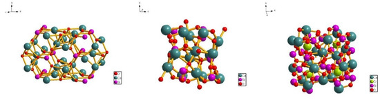 Figure 4 shows the analysis of the crystal structures of C3S, C2S, and uvarovite. C3S crystals are tightly packed with oxygen, calcium, and silicon entering the voids as octahedron and tetrahedron. The apex angles of [SiO4] tetrahedron are independent and exist in an isolated state. C2S is composed of [SiO4]4-tetrahedron and Ca2+. Compared with C3S, C2S has less O2− in ionic composition, making the structure of C2S more stable. In the crystal structure of Ca3Cr2(SiO4)3, trivalent Cr ions, [CrO6], are formed with a coordination number of 6, connected with the isolated [SiO4] tetrahedron, forming some larger distorted cubic voids, and each apex angle is occupied by oxygen. Table 4 shows the radius, coordination number, and electronegativity of each ion. There are large differences in chemical structural parameters such as ionic radius, ligancy, and electronegativity between Cr3+, Ca2+, and Si4+ [26,27]. The ionic radius of Cr3+ lies between those of Ca2+ and Si4+, and its electronegativity is close to that of Si4+. From the point of view of the coordination number, Cr3+ replaces Ca2+, shifting the charge center of the ionic group, and causing the orientation of the silicon–oxygen tetrahedron and the coordination number of calcium to change. This means that the addition of Cr changes the mode of oxygen accumulation or accumulation density, and the cell parameters, resulting in the modification of silicate crystal shape and the generation of new calcium chrome garnet crystals.