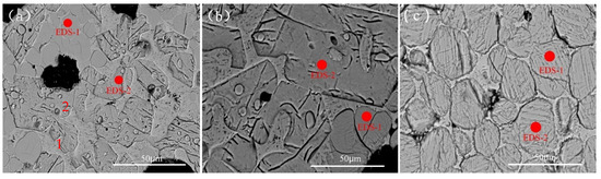 Figure 5a–c depict the SEM images of clinker with 0.8%, 1.0%, and 5.0% Cr, respectively. The SEM backscattering technique was used for these images. Point 1 in Figure 5a is a round grain, and may possibly be C2S. Point 2 is plate-like, and may be C3S. In all the images, the C3S and C2S mineral boundaries are clear and easy to distinguish. When the Cr content is increased to 5.0%, the C2S generation dominates, the aggregation state is strong, the mineral phase agglomerates greatly, and the C3S mineral phase is reduced. The high Cr content is beneficial to the stable formation of C2S and inhibits the formation of C3S. EDS spectrum analysis was performed on some microregions in the SEM images. The results are shown in Table 5. In Figure 5b, the Ca/Si atomic ratio in the EDS-1 microregion is 2.07, which is considered to be the C2S mineral phase, and the Ca/Si atomic ratio in the EDS-2 microregion is 2.67, which is considered to be the C3S mineral phase. The composition of EDS microregion and the content of Cr in mineral phase show that Cr is easily dissolved in C2S, and the content of Cr in C2S increases with the increase of Cr content. When the Cr content is 5.0%, its total mass in the microregion is about 3.98%.
