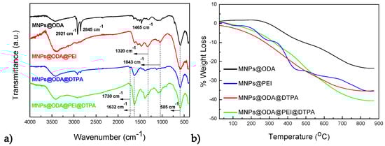 The successful modifications with PEI and/or DTPA on the surface of the primary particles (MNPs@ODA) were observed by FT-IR spectra and are shown in Figure 2a. All samples revealed absorption bands in a good agreement with the pure organic molecules, which are presented as reference in Figure S2. In the initial MNPs@ODA, the asymmetric (2921 cm−1) and symmetric (2845 cm−1) stretching vibrations of the methylene groups and the characteristic peak of ODA at 1465 cm−1 were present. For MNPs@ODA@PEI, all the characteristics peaks of PEI were found, while the C-N stretch vibration appeared shifted at 1320 instead of 1306 cm−1 of the pure PEI (Figure S2) due to the interaction with the particles’ surface. In the case of MNPs@ODA@DTPA and MNPs@ODA@PEI@DTPA, the weak peaks at 1730 cm−1 were ascribed to the protonated carboxylic groups, while the strong peaks at 1632 cm−1 were attributed to the deprotonated asymmetric stretching vibration νas(CO2), indicating that DTPA was partially deprotonated. Finally, in all samples, the typical low frequency band at around 585 cm−1 was caused by the motion of oxygen with respect to the cations in the octahedral (Oh) sites, characteristic of the spinel structure [].