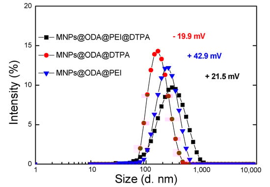 The modified MNPs were homogeneously dispersed in water. The hydrodynamics diameters were found to be equal to 177, 159, and 215 nm for MNPs@ODA@PEI, MNPs@ODA@DTPA, and MNPs@ODA@PEI@DTPA, respectively (Figure 3). In addition, the ζ-potential of their aqueous suspensions at neutral pH were positive for MNPs@ODA@PEI (+42.9 mV) and MNPs@ODA@PEI@DTPA (+21.5 mV) due to the amine groups, while the same for MNPs@ODA@DTPA was found to be negative (−19.9 mV), indicating the presence of deprotonated carboxyl groups (Figure 3).