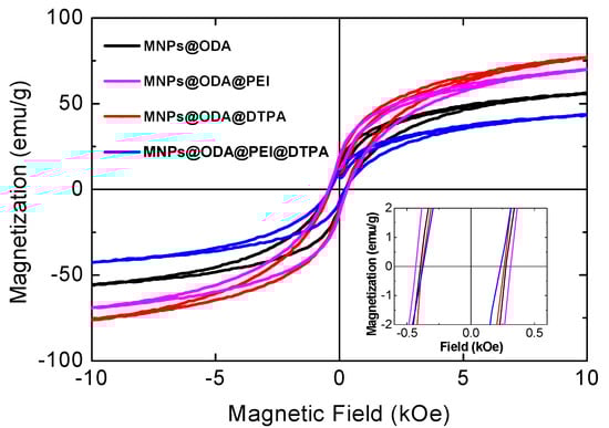 Magnetic properties were examined at room temperature by measuring the magnetization as a function of an external field up to 10 kOe (Figure 4). Remarkably, even though the magnetization of the primary cobalt ferrite MNPs@ODA was found moderate at 45 emu/g, after the surface modifications, it was increased up to 70 emu/g for MNPs@ODA@PEI and up to 77 emu/g for MNPs@ODA@DTPA. For both samples, the increased magnetization stemmed from the adsorbed amine or oxygen ligands (σ-donor), which took the position of the oxygen vacancies and controlled the symmetry and spin–orbit coupling of the surface metal ions more closely to that of the core []. This phenomenon assisted in the compression of the surface spin disorder layer (also called the ‘dead layer’) on the nanoparticles’ surface by repairing the broken and dangling bonds of Fe–O/Co-O, consequently increasing magnetization. In so, these values were relatively higher than those that have been reported for silica-modified CoFe2O4 nanoparticles with similar sizes [,,,]. However, the third modification route (MNPs@ODA@PEI@DTPA) led to reduced magnetization (44 emu/g) in accordance to the larger organic layer detected from the TGA results. For that sample, we speculate that DTPA did not coordinate with the metal cores due to the distance from the surface. Regarding coercivity, the values were found without significant differences ranging from 300 to 370 Oe, indicating the soft-magnetic behavior of the systems before and after the surface reconstructions. The absolute values of magnetization (MS) were estimated from the effective mass of the MNPs in connection with the TGA results (Table S1).