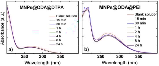 The functionalized samples, MNPs@ODA@PEI, MNPs@ODA@DTPA, and MNPs@ODA@PEI@DTPA, were applied as adsorbents to remove copper ions from water. The UV–Vis titration absorption spectra of the samples in an aqueous solution are provided in Figure 5 and Figure S4, while the detection of Cu2+ was based on the method of Wen et al. []. Firstly, the absorbance of an aqueous solution of copper(II) nitrate (5 mM) was measured in the absence of MNPs (blank solution). Then, aqueous solutions of MNPs (1 mg/mL) were added and left for different time intervals. At the end, the MNPs were magnetically separated, and the absorbance of the supernatants was measured again. From the absorbance, the concentration of the remaining copper(II) nitrate was detected to enable the calculation of adsorption capacities (mg/g) of the samples with the following equation: