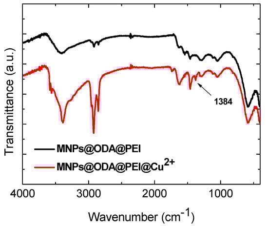 Indicative FT-IR spectra of MNPs@ODA@PEI before and after the adsorption of copper ions.