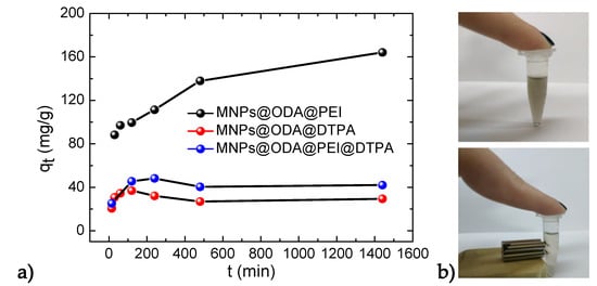 The adsorption tendencies of the two samples, MNPs@ODA@DTPA and MNPs@ODA@PEI@DTPA, were found similar, as they rose sharply within the initial 60 min, and then they remained almost steady even when the contact time was extended to 1400 min. In contrast, the adsorption capacity of the PEI-modified particles (MNPs@ODA@PEI) constantly rose as time increased. Moreover, by using a commercial magnet, the MNPs were rapidly separated from the solution within a few seconds (Figure 7b).