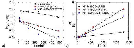 where qe is the equilibrium adsorption capacity of the adsorbent (mg g−1), qt is the adsorption capacity (mg g−1) when the contact time is t, and K and k1 are the rate constants of the pseudo first-order model. On the other hand, the pseudo-second-order model can be expressed as []: