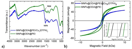 (a) FT-IR spectra of the nanoparticles with (blue line) and without (green line) the presence of the complex and (b) the hysteresis loops of the MNPs before and after the functionalization with the complex.