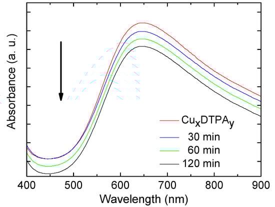 The successful immobilization of the (Cux(DTPA)y) onto the MNPs’ surface was followed by UV–Vis studies (Figure 10). The absorbance spectrum of the complex dissolved in water was located at 645 nm. After the addition of MNPs@ODA@PEI into the solution and their magnetic extraction at different time intervals, the measurement was repeated for the supernatants. The results revealed time-dependent behavior, as the absorbance of the supernatants gradually decreased and confirmed the removal of different portions of the complex. An accurate estimation of adsorption capacity (qt) was inadequate, as the initial concentration (C0) (Equation (1) could not be calculated due to the lack of the molecular weight of the copper complex, as the precise chemical formula was unknown. However, by a rough estimation based on the complex’s absorbance, the magnitude qt values were found to 1.4 mg/g (30 min), 3.0 mg/g (60 min), and 4.2 mg/g (120 min).
