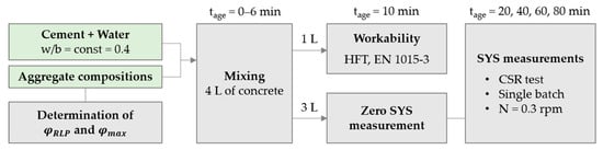 The static rheological properties were measured using the constant shear rate test and the single-batch approach, which were thoroughly described by the authors in [31] and [36]. In summary, the constant shear rate test includes determination of the peak values of torque at the lowest possible constant shear rate, or, more accurately, rotational velocity, at specific concrete ages. The peak values obtained for torque were used to calculate SYS values, while the development of SYS over time provides the structural build-up rate in the material. In the single-batch approach, measurements of peak torque at all ages are performed on a single sample. The alternative is the multi-batch approach, which uses a discrete sample for every concrete age or resting time under investigation in order to prevent continuous disturbance of material and to avoid possibly underestimated results for the structural build-up rate. The authors showed that for cement pastes and cement-based mortars of medium consistency, single-batch approach can be a solid alternative to the multi-batch approach due to minor differences in the results as obtained. Additionally, the time and material savings, the labour efficiency, and the better applicability for in situ testing of the single-batch approach are highlighted here.
